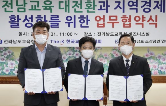 [한국기자연대] 전라남도교육청이 31일 청사 5층 비즈니스실에서 한국교직원공제회·전라남도소상공인연합회와 지역경제 활성화를 위한 업무협약(MOU)을 체결했다.
