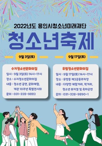 [한국기자연대] 용인시 청소년미래재단(이사장 이상일)은 가을맞이 청소년 축제를 운영한다고 밝혔다. 이번 청소년 축제는 9월 3일 수지청소년문화의집 꿈머굼 축제, 9월 17일 유림청소년문화의집 청소년 문화축제로 청소년과 지역주민이 함께 즐길 수 있는 열린축제의 장을 마련하여 청소년이 주도하는 축제를 개최할 예정이다.
