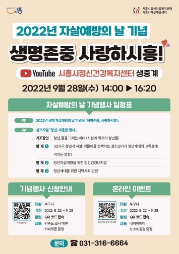 '생명존중, 사랑하시흥!'는 코로나19 확산 방지를 위해 비대면으로 진행하며, 행사는 9월 28일 14시부터 ‘시흥시정신건강복지센터‘ 유튜브 라이브 영상으로 시청할 수 있다.