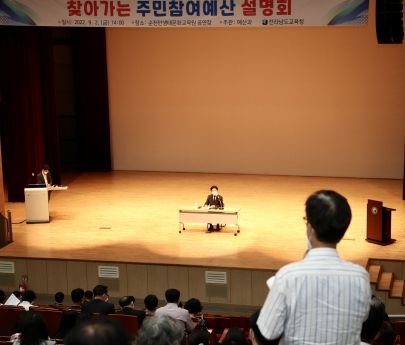 [한국기자연대] 전라남도교육청이 2일 오후 2시 순천만생태문화교육원에서 도민, 학부모, 교직원 등 300여 명이 참석한 가운데 ‘2023년도 예산편성을 위한 찾아가는 주민참여예산 전남동부권 설명회’를 개최했다.