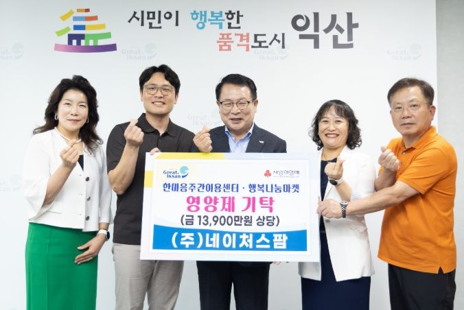 정헌율 익산시장은 "지역사회에 든든한 힘이 되는 나눔을 실천해 주신 ㈜네이처스팜에 감사드린다"며 "후원해 주신 영양제는 도움이 필요한 이웃들에게 소중히 전달하겠다"고 밝혔다.