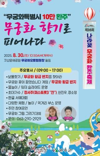 [한국기자연대] 완주군이 광복 80주년을 기념하며 제35회 나라꽃 무궁화 완주축제를 오는 30일 오전 10시 30분에 고산문화공원(무궁화오토캠핑장 일원)에서 개최한다.