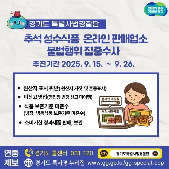 [한국기자연대] 경기도는 9월 15일부터 26일까지 추석 명절을 앞두고 성수식품 온라인 판매업소 360곳을 집중 수사한다고 밝혔다.