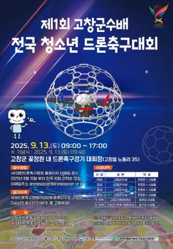 [한국기자연대] 고창군이 오는 13일 고창 꽃정원(고창읍 노동리 35)에서 ‘제1회 고창군수배 전국 청소년 드론축구대회’를 개최한다고 밝혔다.