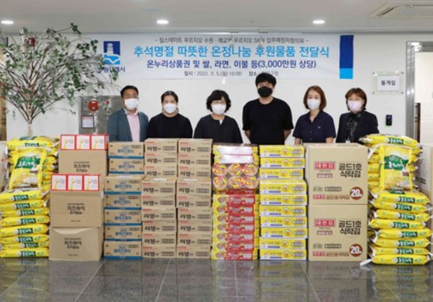[한국기자연대] 수원시 팔달구는 5일 팔달구청에서 힐스테이트 푸르지오 수원과 매교역 푸르지오 SK뷰 입주예정자협의회와 함께 쌀, 라면, 스팸, 참치, 온누리상품권 등 3천만원 상당의 한가위 후원물품 전달식을 가졌다.