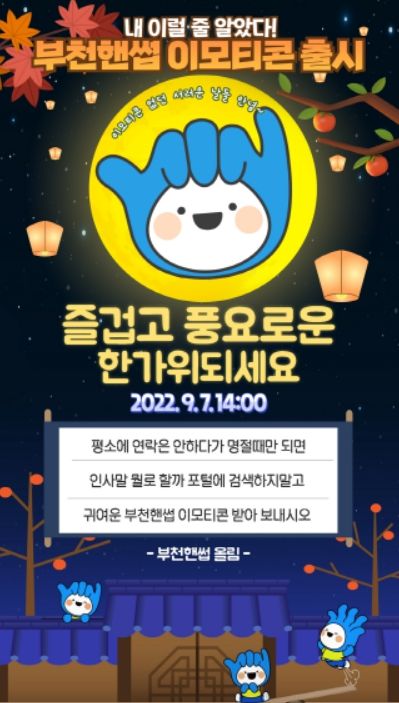 [한국기자연대] 부천시가 새롭게 리뉴얼된 부천핸썹으로 시민들게 친숙하게 다가가기 위해 추석맞이 ‘부천핸썹 이모티콘 무료 배포 이벤트’를 진행한다.