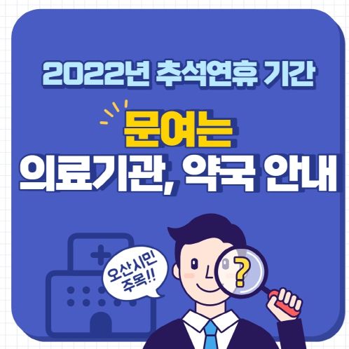 추석 연휴기간 중 이용 가능한 의료기관과 약국 정보는 오산시 및 오산시보건소 홈페이지, 응급의료포털, 응급의료정보제공 어플, 보건복지부 콜센터(129), 경기도 콜센터(120), 119구급상황관리센터 등을 통해 확인할 수 있다.