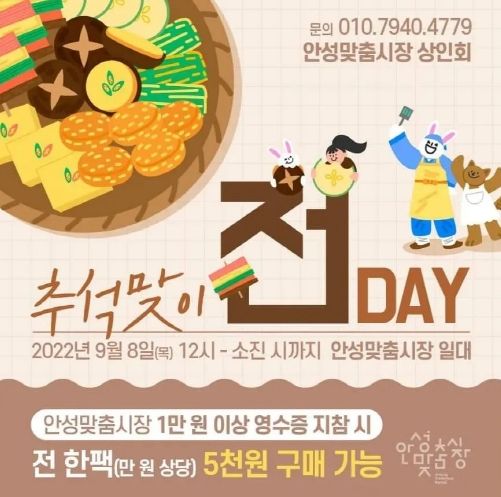 안성맞춤시장에서는 9월 8일 낮 12시부터 오후 5시까지 문화콘서트와 함께 시민 및 상인들로 구성된 플리마켓을 진행하면서 다채로운 전을 만들어 판매하는 전데이 행사도 개최한다. 또한 시장에서 장을 본 후 1만원 이상 영수증 지참 시 1만원 상당의 전 1팩을 5천원으로 할인해 주는 쿠폰도 증정한다. 이 밖에도 어린이 전통의상 체험, 떡 만들기 체험과 윷놀이, 제기차기, 온누리상품권 경품도 준비돼 있다.
