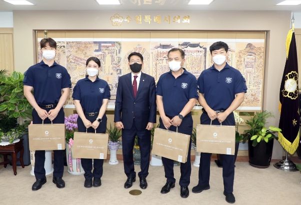 [한국기자연대] 김기정 수원특례시의회 의장이 7일 시청 현업 근무자들을 찾아 격려물품을 전달하고, 그동안의 노고에 감사를 전했다.