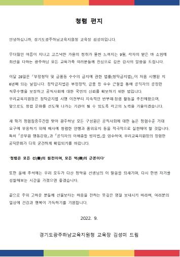 [한국기자연대] 경기도광주하남교육지원청 김성미 교육장은 2022년 하반기 새 학기 청렴 집중 주간을 맞아 관내 약 5천여 교직원을 대상으로 청렴 편지를 발송했다.