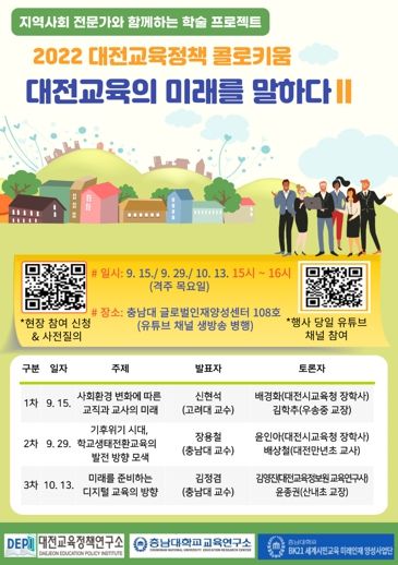[한국기자연대] 대전교육과학연구원 대전교육정책연구소는 9월 15일부터 10월 13일까지 격주 목요일 총 3회에 걸쳐, 충남대학교 교육연구소 및 충남대학교 BK21 세계시민교육미래인재양성사업단과 공동 주관 하에 2022년 대전교육정책 콜로키움을 온 오프라인 병행하여 개최한다고 밝혔다.