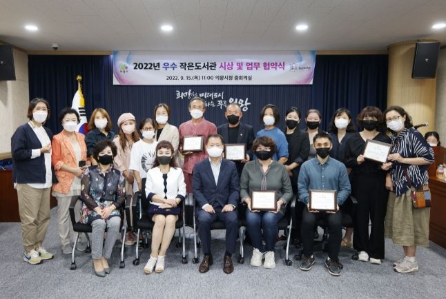 [한국기자연대] 의왕시는 15일 시청 중회의실에서 관내 작은도서관 관장 및 유관기관 단체장 등 25명이 참석한 가운데 2022년 우수 작은도서관 시상 및 업무 협약식을 진행했다.