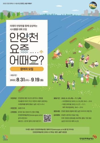 참가 신청은 안양문화예술재단 홈페이지에서 온라인으로 가능하며, 수변 문화를 함께 만들고 싶은 성인 누구나 참여 가능하다. 선착순으로 총 30명 모집하며, 참여자들에게는 안양천 네트워크 커뮤니티 형성을 위한 지원과 안양천 프로젝트 활동 기회를 제공할 예정이다. 프로그램 관련한 자세한 사항은 안양문화예술재단 홈페이지를 참고하면 된다.