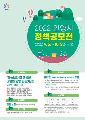 [한국기자연대] 안양시는 시민이 주도하는 중단없는 안양발전을 위해 ‘2022 안양시 정책공모전’을 다음달 3일까지 실시한다고 14일 밝혔다.