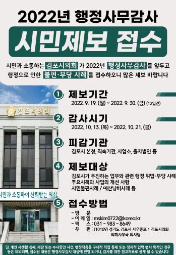 [한국기자연대] 김포시의회(의장 김인수)가 2022년도 행정사무감사를 앞두고 9.19일부터 9.30일까지 12일간 시민제보를 접수한다고 16일 밝혔다.
