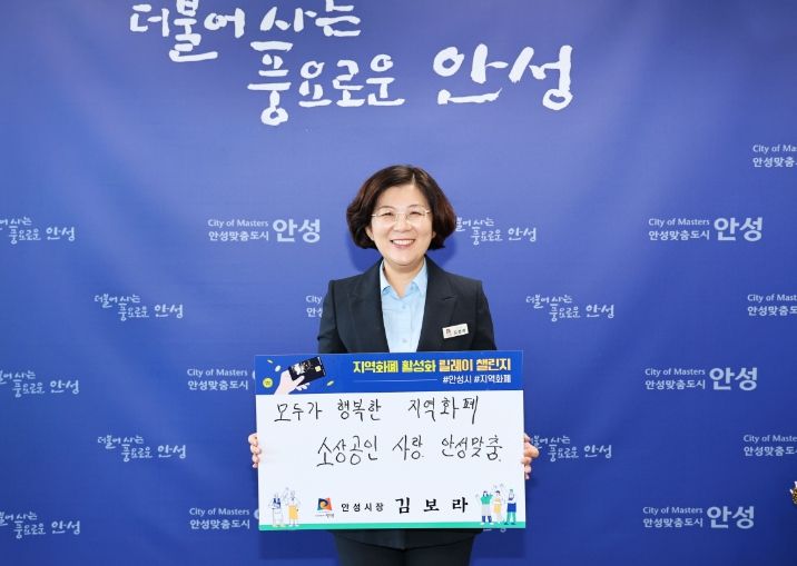 오는 9월 30일부터 10월 3일까지 열릴 ‘2022 안성맞춤 남사당 바우덕이 축제’를 앞두고 지역경제 활성화를 위해 각고의 노력을 펼치고 있는 김보라 시장은 시민들에게 지역화폐 사용을 독려하고 전통시장 및 골목상권을 살리기 위한 이번 챌린지에 동참하면서 페이스북에 ‘모두가 행복한 지역화폐, 소상공인 사랑 안성맞춤!’이라는 주제어로 챌린지 사진을 게시했다.