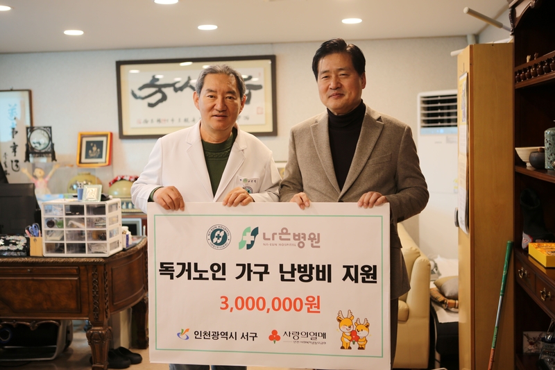 인천나은병원(병원장 하헌영)은 겨울철 에너지 취약계층의 생활 안정을 위해 인천 서구 내 독거노인 가구에 난방비 300만 원을 지원했다고 밝혔다. 난방비 전달식은 병원에서 진행됐으며, 강범석 인천 서구청장을 비롯한 구청 관계자와 사랑의열매 인천사회복지공동모금회 관계자 등이 참석했다.