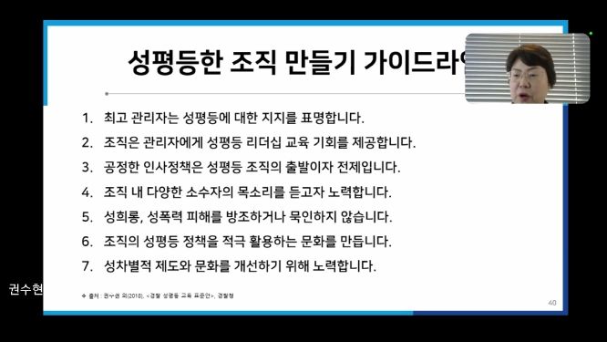 ‘함께 만드는 성평등 조직 문화’를 주제로 강의한 권수현 평등공작소나우 대표는 ▲성인지(性認知) 관점의 중요성 ▲성인지 관점과 조직 문화 ▲성평등 조직 문화를 만드는 관리자의 리더십 등을 설명했다.