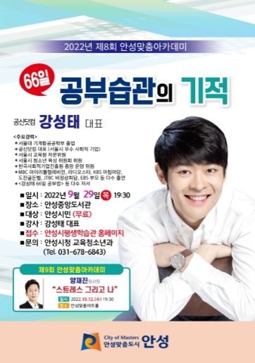 [한국기자연대] 안성시는 오는 29일 저녁 7시 30분 안성중앙시립도서관 다목적홀에서 공신닷컴 강성태 대표를 초청해 ‘66일 공부습관의 기적’을 주제로 제8회 안성맞춤 아카데미를 개최한다.