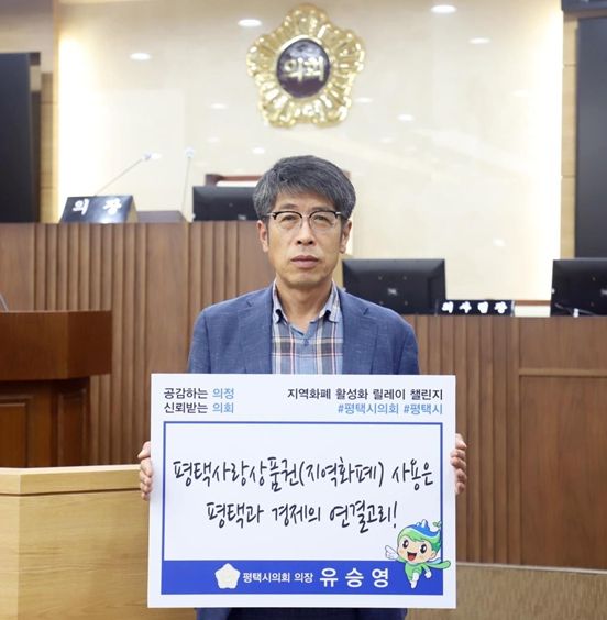 [한국기자연대] 평택시의회 유승영 의장은 28일 민생 안정과 지역경제 활성화를 위해 ‘지역경제 살리는 지역화폐 사용 함께해요’ 릴레이 챌린지에 동참했다.