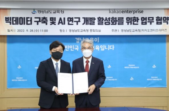 [한국기자연대] 경상남도교육청은 9월 28일 경남교육청 중회의실에서 카카오엔터프라이즈와 ‘아이톡톡’의 교육 데이터에 기반한 인공지능(AI)을 개발하기 위한 업무협약을 체결했다.