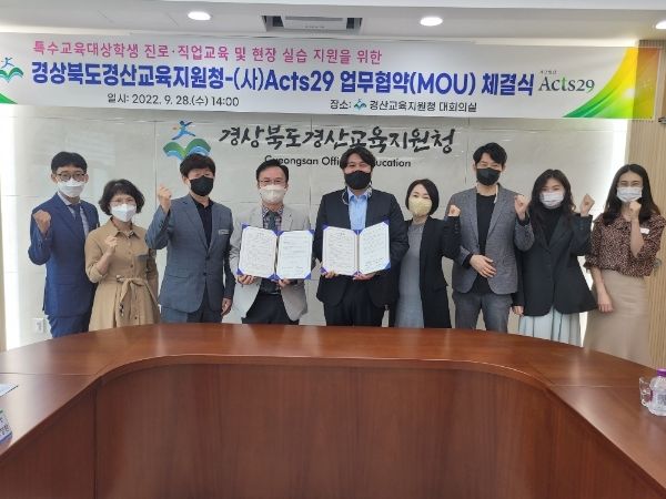 [한국기자연대] 경산교육지원청은 9월 28일 경산교육청 대회의실에서 사단법인 Acts29(아시아스페셜티커피협회장 배승덕)와 특수교육대상학생의 바리스타 자격취득 과정 및 직무훈련 지원을 위한 업무협약을 체결했다.