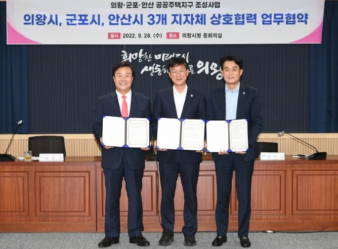 [한국기자연대] 안산시는 지난 28일 의왕시청에서 성공적인 공공주택지구 조성을 위해 ‘의왕·군포·안산 공공주택지구 업무 협력 협약’을 체결했다고 29일 밝혔다.