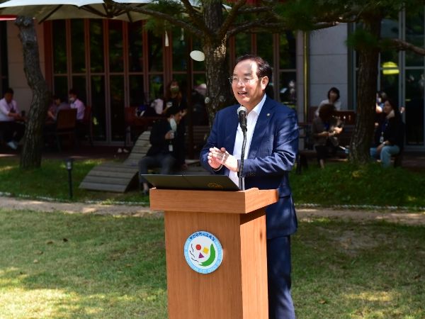 [한국기자연대] 하윤수 부산광역시교육감이 30일 낮 12시 시교육청 본관 앞 잔디밭에서 ‘청렴 문화 주간’ 행사의 하나로 열린 ‘소통·공감의 청렴 힐링 콘서트’에서 직원들을 격려하고 있다.