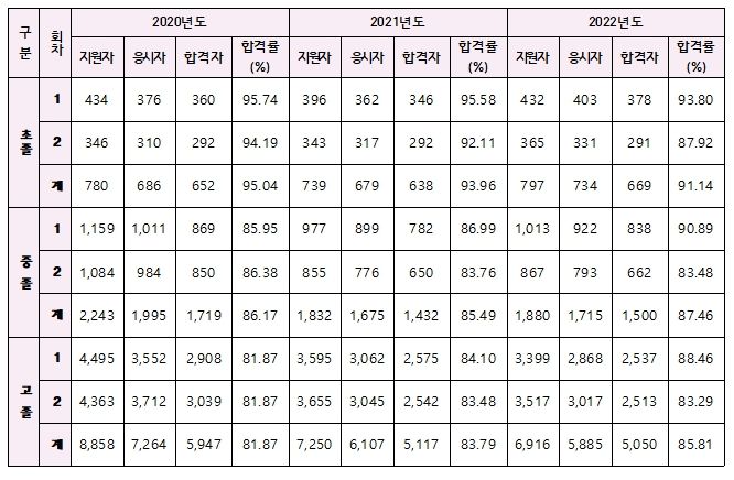 한편, 금년도 2회 검정고시는 4,141명이 응시하여 3,466명이 합격했으며 합격률은 83.70%를 보였다.