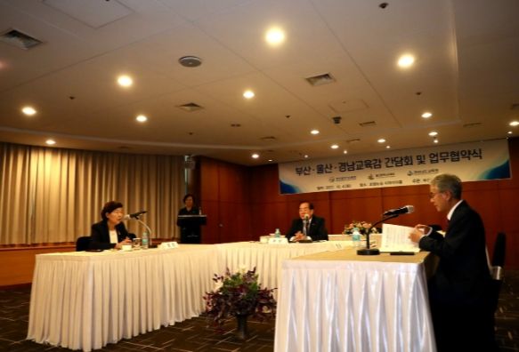 노옥희 울산시교육감, 하윤수 부산시교육감, 박종훈 경남교육감은 4일 부산에서 교육감 간담회를 열고 상호발전을 위한 업무협약을 체결했다.