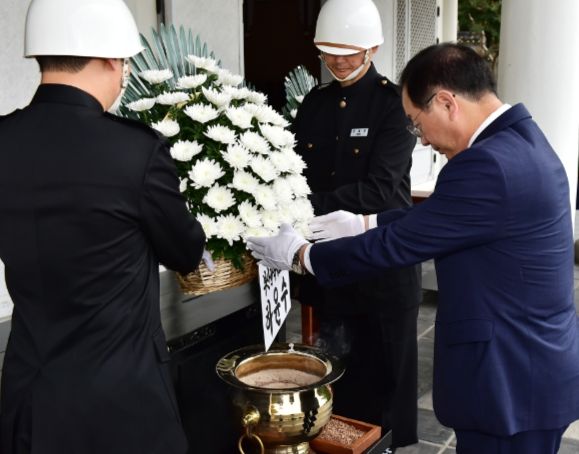 [한국기자연대] 하윤수 부산광역시교육감이 5일 오전 9시 동래구 충렬사에서 ‘제43회 부산시민의 날 기념식’에 앞서 헌화와 분향을 했다.