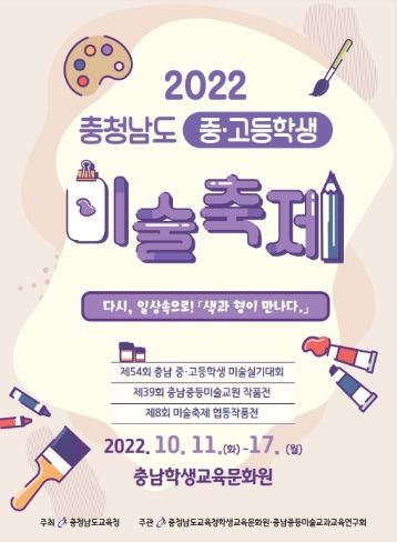 충남 중고등학생 미술축제는 매년 가을에 개최하는데, 각 지역별로 실시한 중고등학생 미술실기 대회 우수작과 협동화, 미술교과 수업 산출물 등을 전시하는 축제로 그동안 코로나19로 인해 온라인으로 전시하던 것을 올해는 현장 전시회를 개최하여 누구나 직접 감상할 수 있도록 했다.