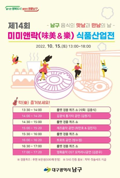 [한국기자연대] 대구광역시 남구는 오는 15일, 오후 1시부터 6시까지 고산골 메타세콰이어길(용두1길 73) 일원에서 “남구 복지 박람회”와 연계하여 “제14회 미미앤락(味美&樂) 식품산업전”을 개최한다고 13일 밝혔다.