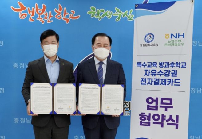 [한국기자연대] 충청남도교육청은 18일 NH농협은행 충남영업본부와 특수교육대상학생 방과후학교 자유수강권 전자결제카드 도입을 위한 업무협약을 체결하고 내년 3월부터 관련 서비스를 시행하기로 했다.