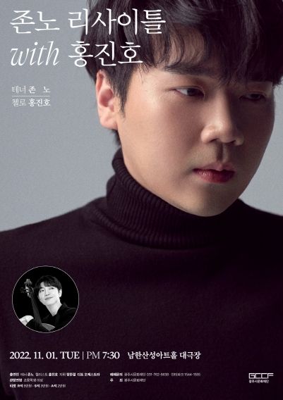 [한국기자연대] (재)광주시문화재단(대표이사 오세영)은 오는 11월 1일 남한산성아트홀 대극장에서 테너 존노와 첼리스트 홍진호가 함께 하는 '존노 리사이틀 with 홍진호' 공연을 진행한다고 밝혔다.