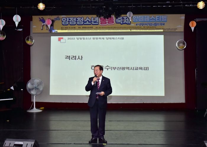 [한국기자연대] 하윤수 부산광역시교육감이 22일 오후 2시 양정청소년수련관 대강당에서 청소년과 주민 등 200여 명이 참가한 가운데 열린 ‘2022 양정청소년동동 축제’에서 인사말을 하고 있다.