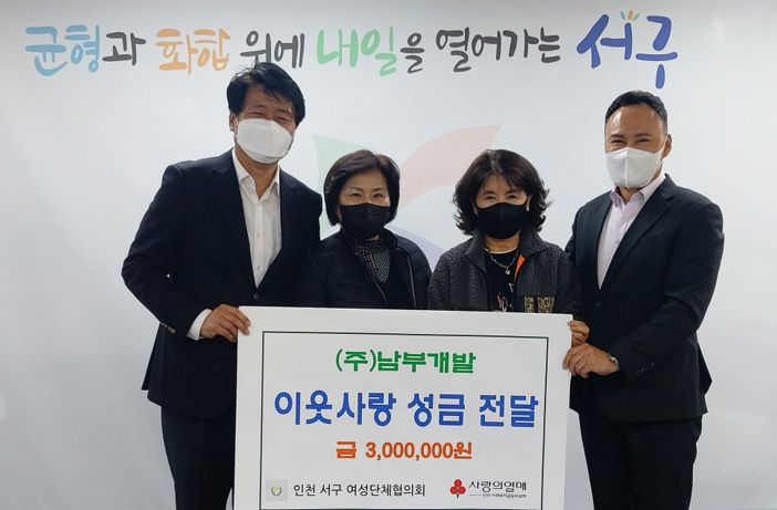 [한국기자연대] 인천 서구는 21일 ㈜남부개발이 이웃사랑 성금 3백만 원을 서구 여성단체협의회에 기탁했다고 밝혔다.