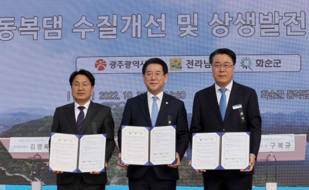 김영록 전라남도지사는 31일 화순 동복댐에서 강기정 광주시장, 구복규 화순군수와 함께 광주․전남 생상발전 현안과제 중 하나인 동복댐 상수원 공동관리 및 주변 낙후된 주민 생활환경 개선 협약을 했다.