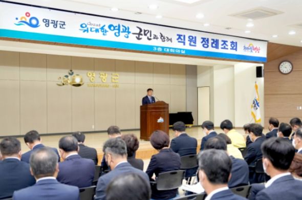 [한국기자연대] 강종만 영광군수는 11월 1일 군청 3층 대회의실에서 공직자 200여 명이 참석한 가운데 11월 중 정례조회를 열고 직원들과 소통하는 자리를 가졌다.
