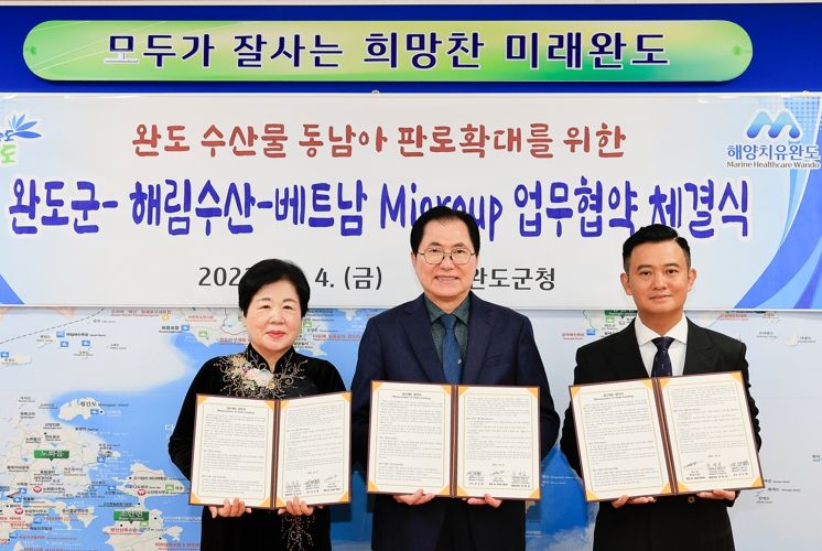 [한국기자연대] 완도군은 11월 4일 완도군청에서 유한회사 해림수산, 베트남 미그룹과 완도 수산물의 원활한 수출을 위해 업무 협약을 체결했다.