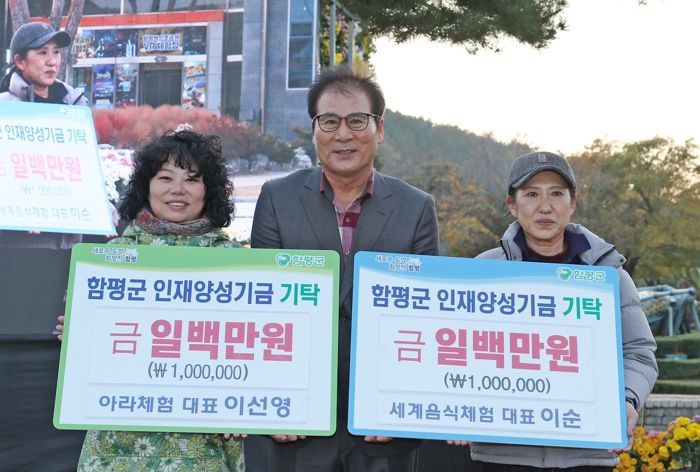 6일 군에 따르면 국향대전 한복 대여업체인 아라체험 대표 이선영 씨와 세계음식 블루파이브오션 대표 이순 씨가 함평군 인재양성기금으로 각각 1백만원을 기탁했다.