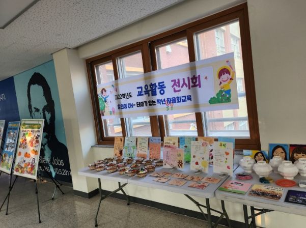 인성 ON! 마음을 키우는 독서교육, 창의성 ON! 테마가 있는 학년 자율화 교육 내용은 각 학년별로 다양한 작품 및 활동사진 자료 전시를 통해 1년간 교육 활동 내용을 서로 공유했다.