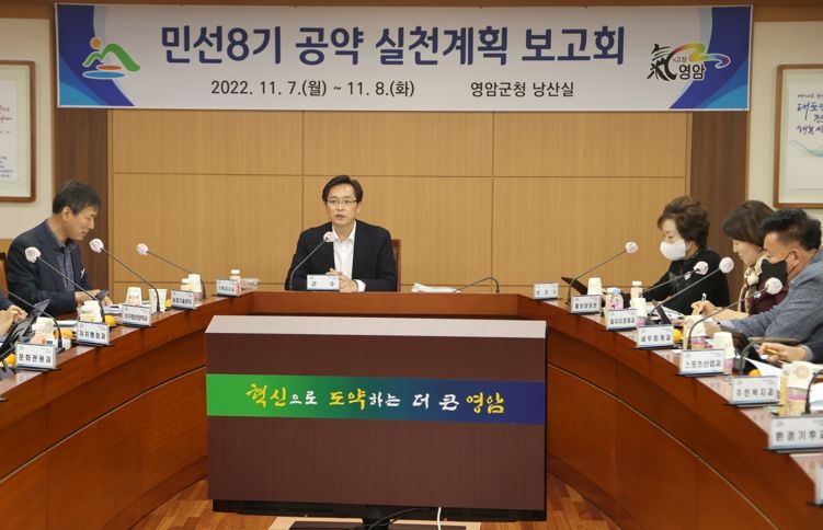 보고회에서는 민선8기 10개 분야 120개 공약사업의 목표, 사업개요, 연차별 추진계획 및 소요예산 등이 면밀하게 검토됐으며, 공약사업의 전략적 추진으로 영암의 변화와 발전을 꾀하고 미래 전략을 세우는 뜻깊은 시간이 됐다.
