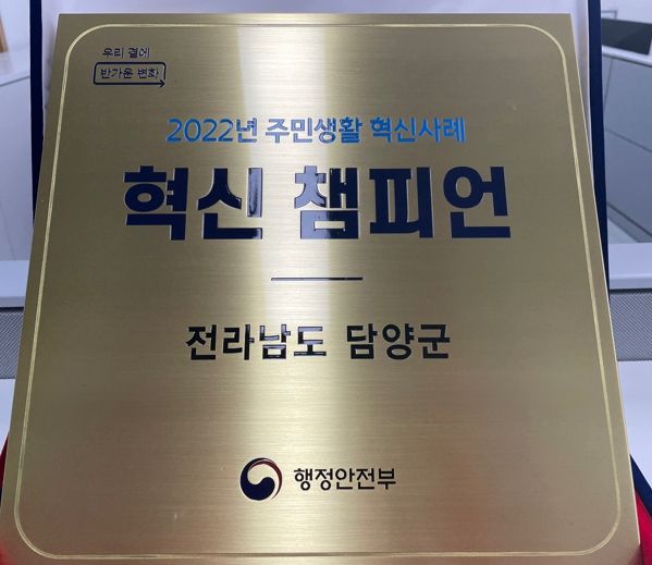 [한국기자연대] 담양군은 11일 부산 벡스코에서 개최된 ‘2022년 주민생활 혁신우수기관 인증패 수여식’에서 우수기관으로 선정되어 혁신 챔피언 인증패를 수상했다.