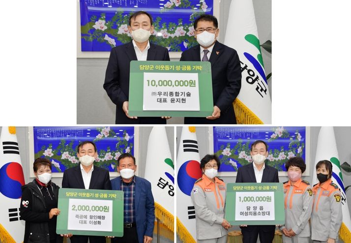 이병노 담양군수는 “매년 지역사회의 어려운 이웃들을 위해 따뜻한 사랑을 나누어주시는 분들에게 감사의 말씀을 드리며, 코로나19 지속으로 힘든 상황이지만 어려운 이웃을 위한 나눔 분위기가 활성화 될 수 있도록 지속적인 관심을 부탁드린다”고 전했다.