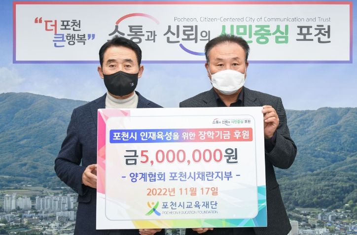 [한국기자연대] (재)포천시교육재단은 지난 17일 양계협회 포천채란지부와 포천양문패션칼라협동조합에서 지역 우수인재 육성을 위한 장학기금을 각 5백만 원씩 기탁했다고 밝혔다.