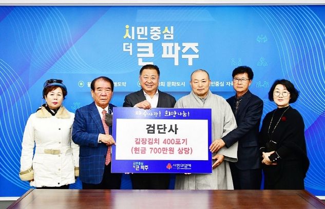 김경일 파주시장은 “김장 한 포기 한 포기에 담긴 온정으로 더불어 사는 지역 공동체를 만드는 데 앞장서주셔서 감사드리며, 이 외에도 지속적으로 나눔 봉사를 실천해주신 검단사에 감사드린다”고 전했다.