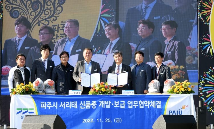 [한국기자연대] 파주시는 25일 파주시 장단콩 축제장인 임진각평화누리공원에서 경기도농업기술원과 파주시 서리태 신품종 개발보급을 위한 업무협약을 체결했다.