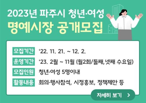 [한국기자연대] 파주시는 시민들의 시정 참여 기회를 확대하고 다양한 시민들의 의견을 시정에 반영하기 위해 청년과 여성, 청소년, 장애인 등 각 분야의 시민을 일일명예시장으로 임명할 예정이라고 밝혔다.