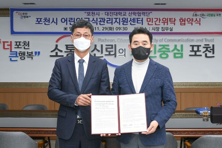 협약식은 백영현 포천시장과 김명운 대진대학교 산학협력단장 등 관계자가 참석한 가운데 개최됐다. 대진대학교 산학협력단은 2023년 1월부터 2025년 12월까지 3년간 포천시 어린이 급식관리지원센터를 운영하게 된다.